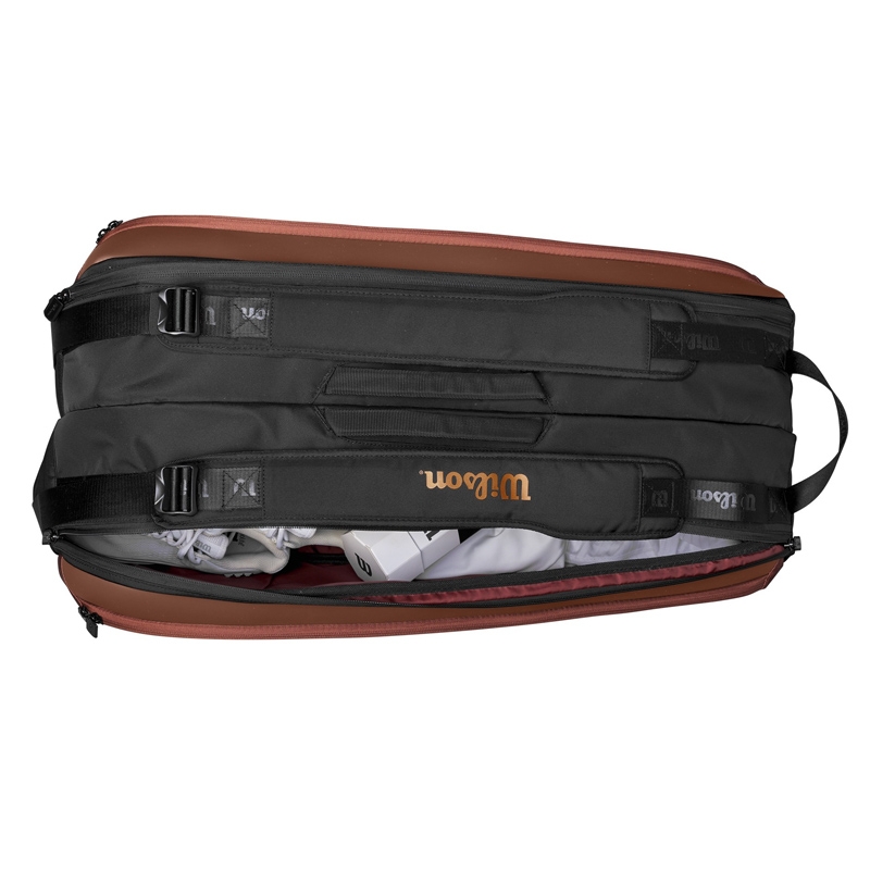 Super Tour Pro Staff 系列融合了對標誌性 Pro Staff 系列的致敬與卓越的功能性能,專為全球網球純粹主義者設計。該系列的 9 支裝球拍在其兩個主要隔層中最多可容納 9 個球拍,其中一個隔層配備了 Thermoguard 以保護物品免受高溫影響。它還具有大的外部側袋、方便攜帶的雙重攜帶選項,以及增強耐用性的加固側板。
